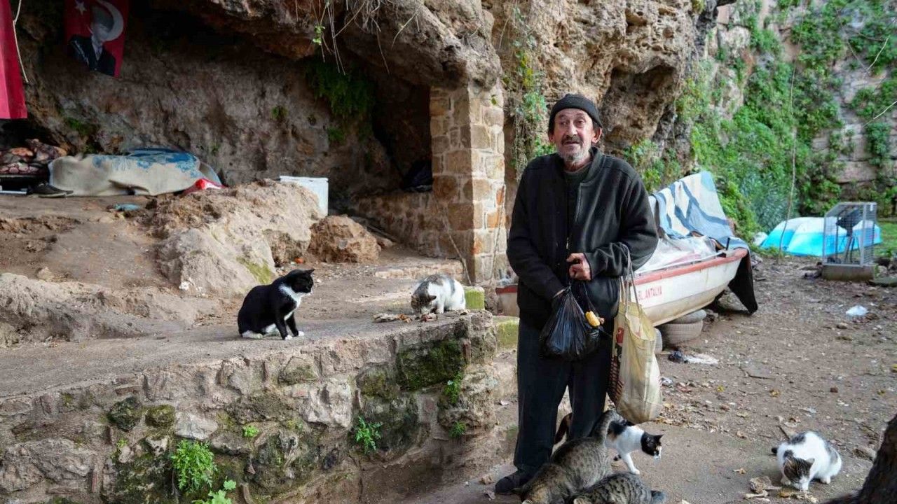 Antalya’nın falezlerindeki tarihi surlarda bulunan bir oyukta 4 yıldır hayatını sürdüren 63 yaşındaki Hüseyin Urlu, sade hayatı ve hayvan sevgisiyle dikkat çekiyor. İnsanlardan gördüğü kötülüklerden uzaklaşıp kendisini kedilere adadığını dile getiren Urlu, “Gideceğimiz yer iki metre toprak, iki metre kefen. Dünya senin olsa neye yarar? Başka bir şey götüremiyoruz ki” şeklinde konuştu.