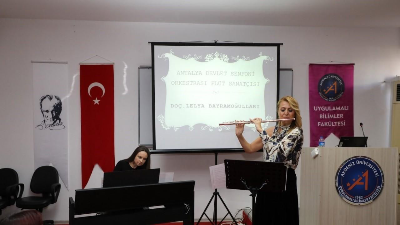 Akdeniz Üniversitesi Uygulamalı Bilimler Fakültesi ve Kadın Çalışmaları ve Toplumsal Cinsiyet Araştırma ve Uygulama Merkezi (KATCAM) iş birliği ile Uygulamalı Bilimler Fakültesi Konferans Salonu’nda Antalya Devlet Senfoni Orkestrası Flüt Sanatçısı Lelya Bayramoğulları’nın konseri düzenlendi.