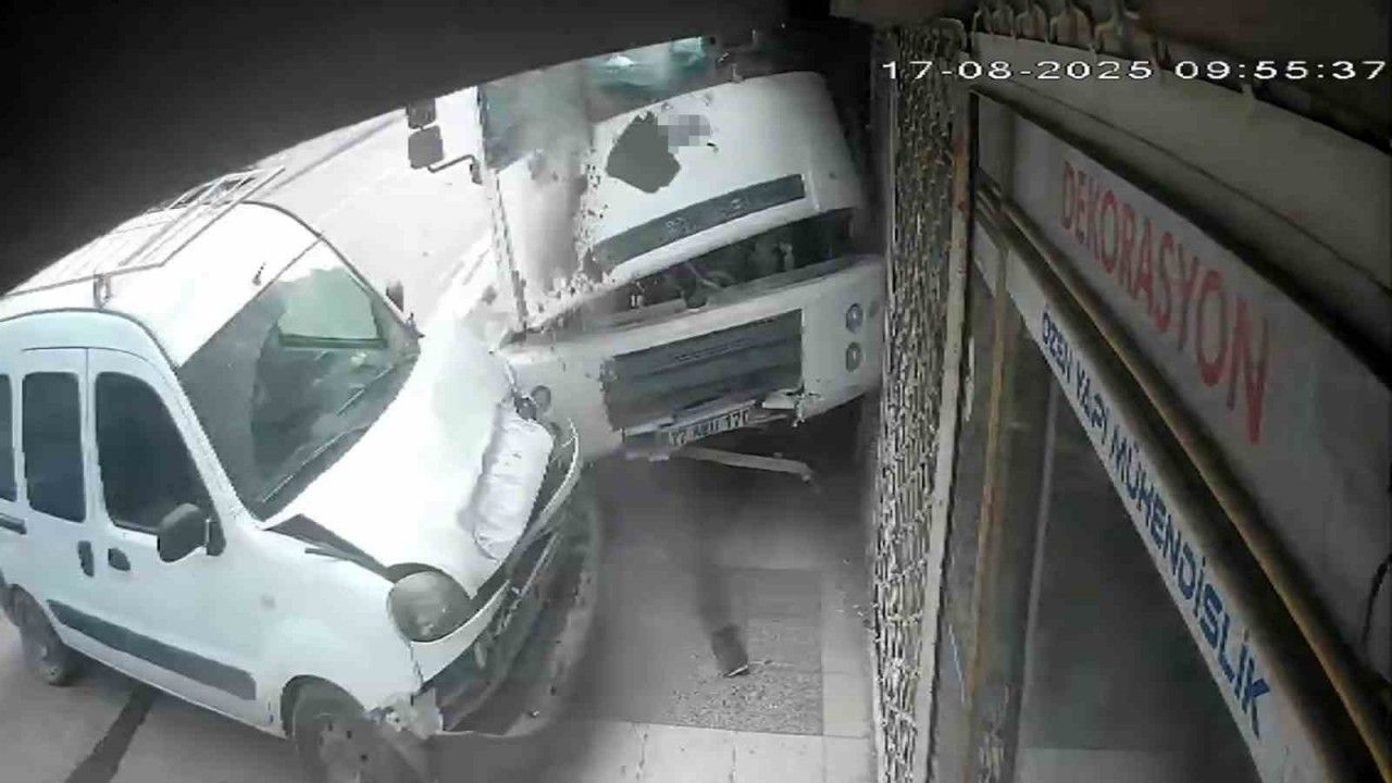 Hatay’da freni boşalan arazöz, park halindeki araçlara ve bir iş yerine çarptı. O anlar kameraya yansıdı ve sürücü kendini araçtan atarak yaralı şekilde kurtuldu.