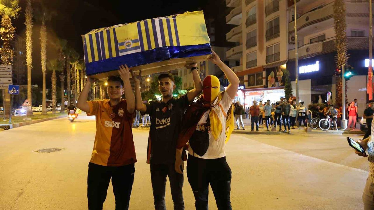 Şampiyonluğunu ilan eden Galatasaray’ın Adana Kozan’daki bazı taraftarları, Fenerbahçe bayrağını tabuta sararak davul zurna ile kutlama yaptı.