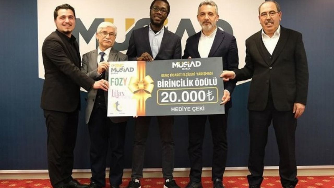 Türkiye'de eğitim gören uluslararası öğrenciler için dış ticaret eğitimi ve staj programını içeren 'Genç Ticaret Elçileri' projesi kapsamında düzenlenen ‘Ürün Pazarlama Simülasyonu Yarışması’ MÜSİAD Bursa Şubesi'nde gerçekleştirilen final programıyla sona erdi. Genç MÜSİAD Bursa tarafından organize edilen yarışma kapsamında, ödüller sahiplerini buldu.BURSA (İGFA) - Bursa'da eğitim gören yabancı uyruklu öğrencilerin mesleki ve kişisel gelişimlerini artırmak ve Müstakil Sanayici ve İşadamları Derneği (MÜSİAD) Bursa üyelerinin firmalarında istihdam edilmelerini sağlamak amacıyla başlatılan 'Genç Ticaret Elçileri' projesi kapsamında düzenlenen ‘Ürün Pazarlama Simülasyonu Yarışması’ final programı gerçekleştirildi. Bu yıl dördüncüsü düzenlenen yarışmaya 20'den fazla ülkeden 42 yarışmacı katıldı. Alanında uzman, girişimci ve profesyoneller tarafından verilen satış, pazarlama, işletme yönetimi, insan kaynakları, dış ticaret ve sunum teknikleri eğitimleri sonrasında gerçekleştirilen ön elemelere 13 öğrenci kalırken, ön elemeler sonrasında finale kalan dört öğrenci final etabında yaptıkları sunumlarla yarıştı. 2022 yılı Kuran-ı Kerim’i güzel okuma Bursa birincisi ve Marmara üçüncüsü Hafız Ufuk Genç’in Kuran-ı Kerim tilaveti ile başlayan final programına MÜSİAD Bursa Şubesi Yönetim Kurulu Başkanı Alparslan Şenocak, Sektör Kurulları Başkanı Halil Atalay, Bursa Teknik Üniversitesi (BTÜ) İnsan ve Toplum Bilimleri Fakültesi Dekanı Prof. Dr. Ahmet Zeki Ünal, Genç MÜSİAD Bursa Şubesi Başkanı Süleyman Nesih Çil ve MÜSİAD Bursa Şubesi üyeleri katıldı.