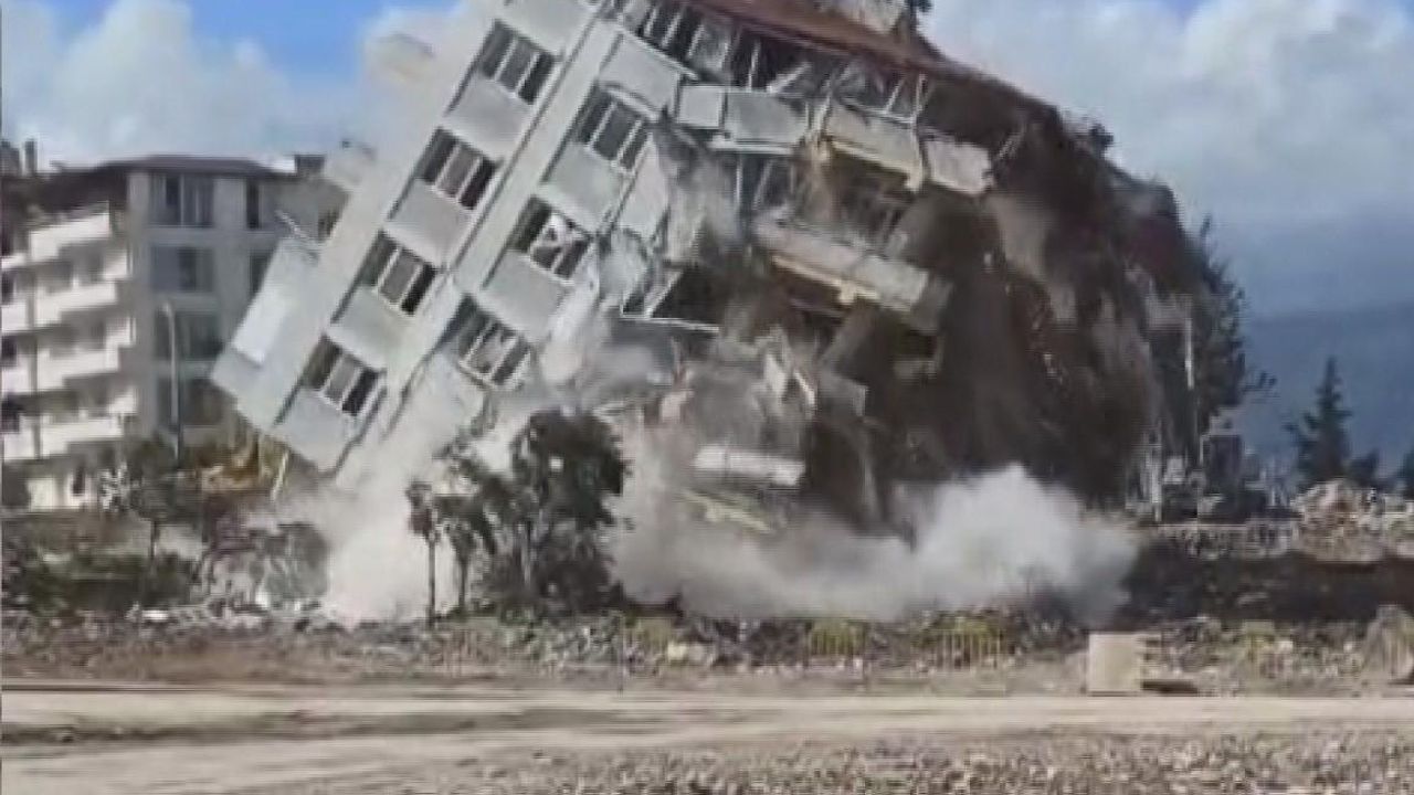 Hatay’ın Antakya ilçesinde halatla çekilerek yıkılan 6 katlı binanın domino taşı gibi devrildiği anlar kamera yansıdı.
