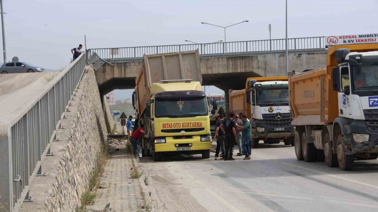 Hatay’ın Antakya ilçesinde üst geçitten çevreyoluna devrilen hafriyat kamyonunun sürücüsü yaralandı.