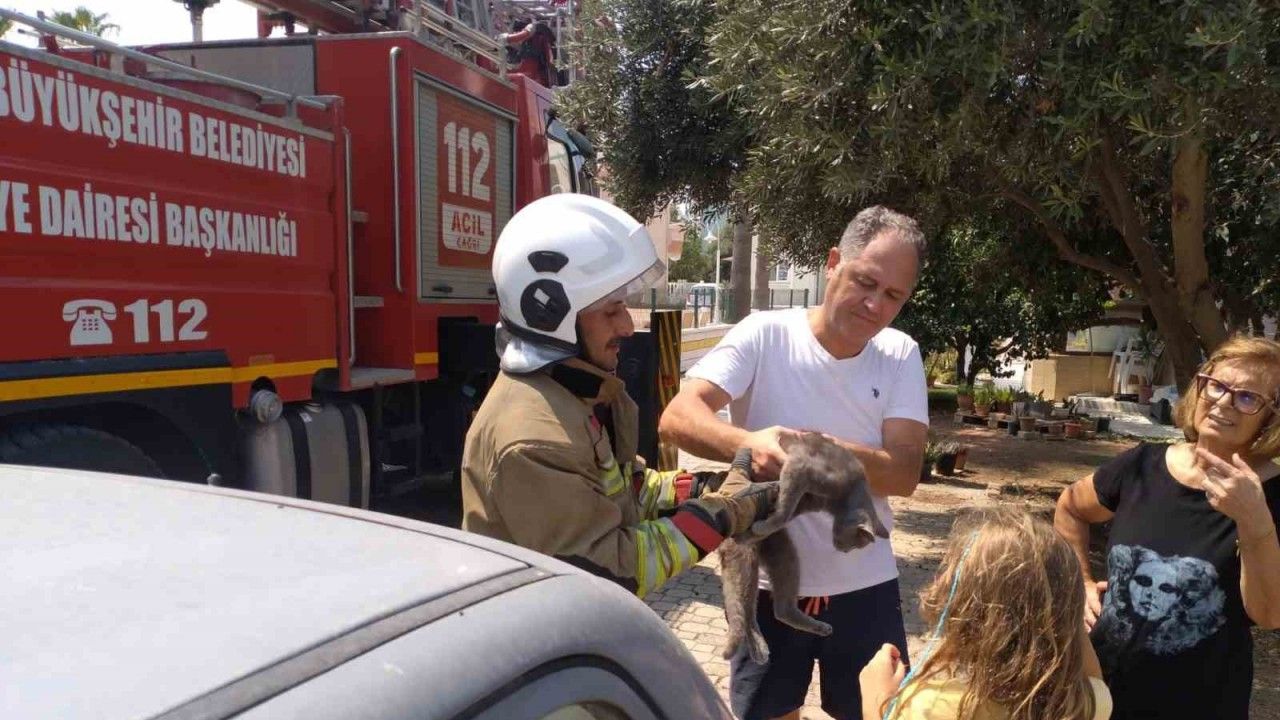 Hatay’ın Arsuz ilçesi bir palmiye ağacında mahsur kalan kedi, ekiplerin başarılı çalışmasıyla kurtarıldı.