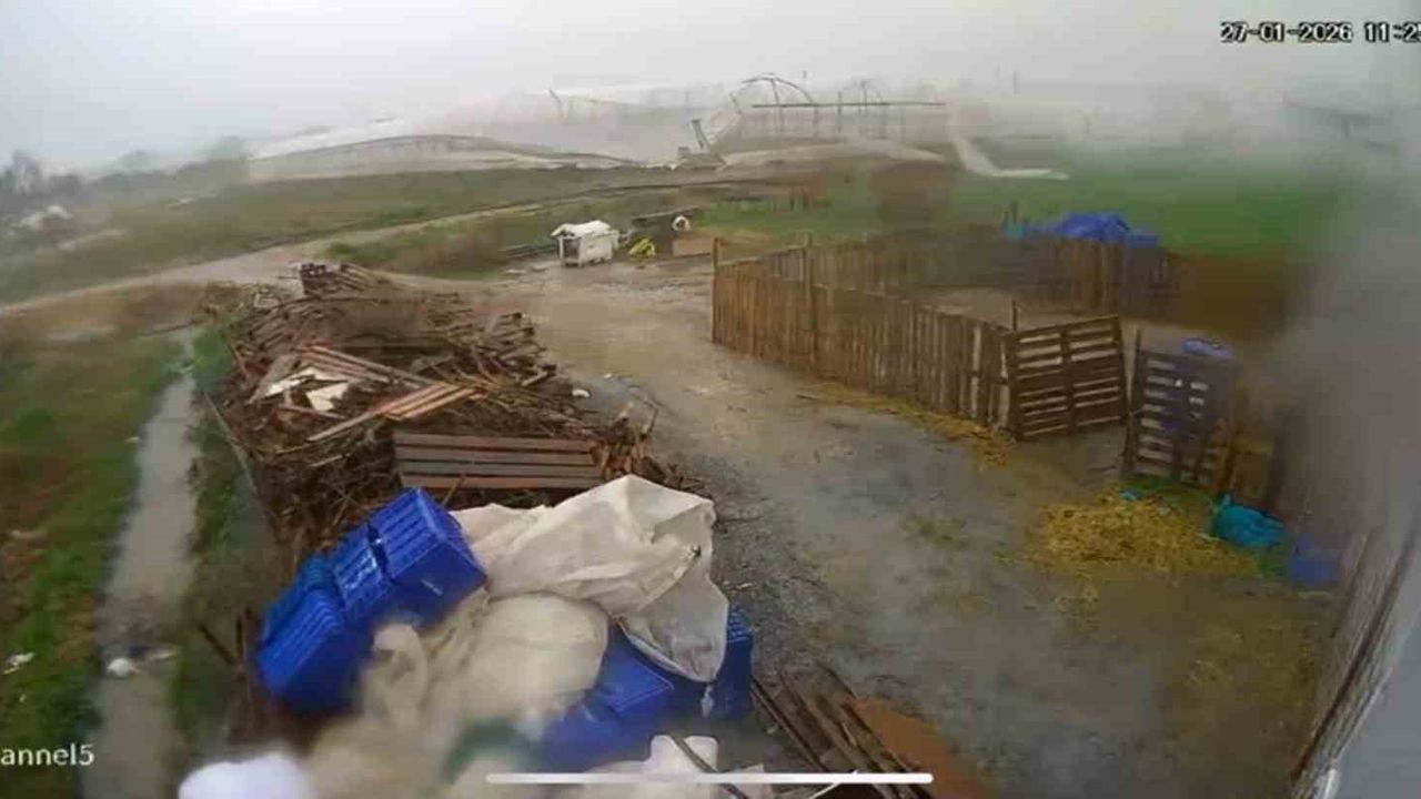 Antalya'nın Serik ilçesinde meydana gelen hortumun serayı saniyeler içinde yerle bir ettiği anlar güvenlik kamerasına yansıdı.