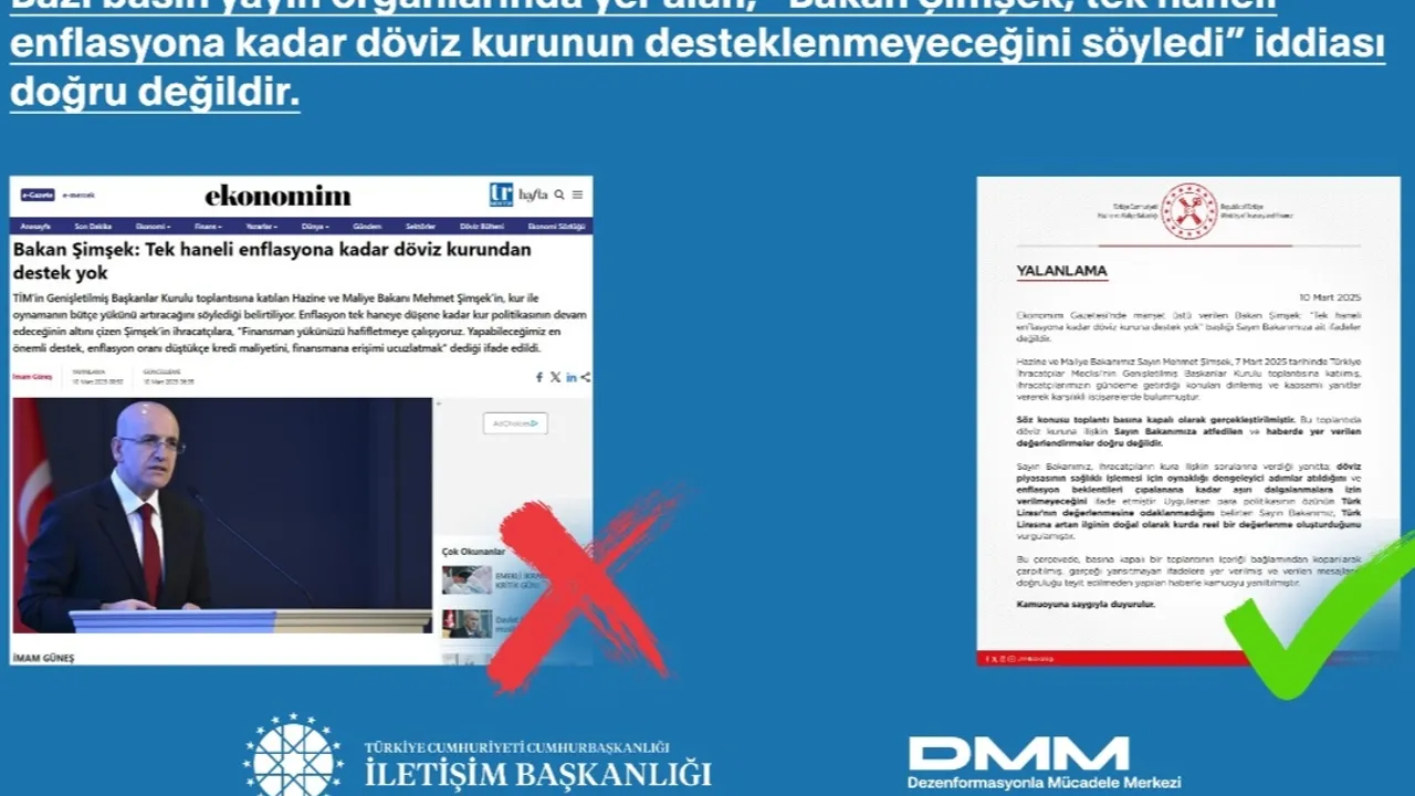 Dezenformasyonla Mücadele Merkezi'nden yapılan yazılı açıklamada, "Hazine ve Maliye Bakanı Mehmet Şimşek, 7 Mart 2025 tarihinde Türkiye İhracatçılar Meclisi'nin Genişletilmiş Başkanlar Kurulu toplantısına katılmış; basına kapalı toplantıda ihracatçıların gündeme getirdiği konulara kapsamlı yanıtlar vermiştir. Bu toplantıda döviz kuruna ilişkin Bakan Şimşek’e atfedilen ve haberde yer verilen değerlendirmeler doğru değildir. Bahse konu toplantıda, Bakan Şimşek’in açıklamalarının bağlamından koparıldığı ve manipüle edilerek servis edildiği belirlenmiştir. Bakan Şimşek, ihracatçıların kura ilişkin sorularına verdiği yanıtta; döviz piyasasının sağlıklı işlemesi için oynaklığı dengeleyici adımlar atıldığını ve enflasyon beklentileri çıpalanana kadar aşırı dalgalanmalara izin verilmeyeceğini ifade etmiştir. Kamuoyunu yanıltmaya yönelik manipülatif haberlere itibar etmeyiniz" ifadeleri yer aldı.