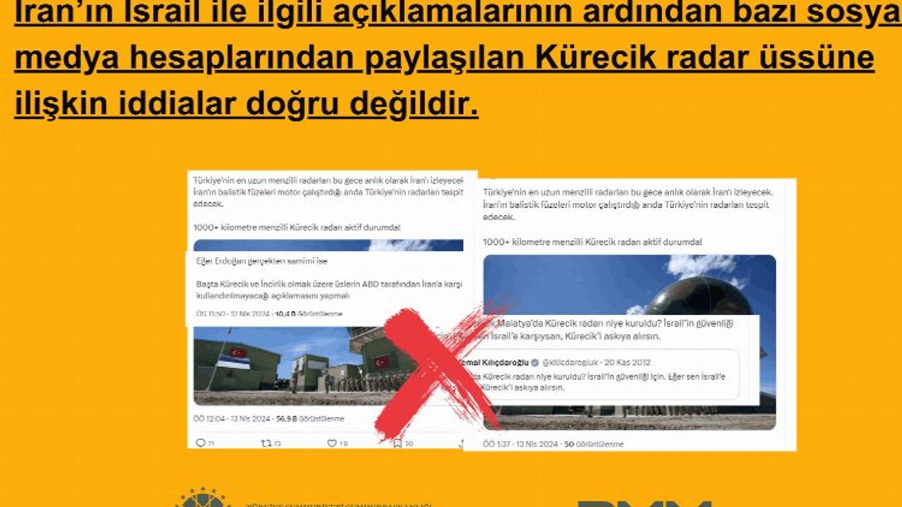 Dezenformasyonla Mücadele Merkezi, "İran'ın 15 Nisan'da İsrail'e fırlattığı füzeler, Malatya Kürecik'te bulunan radar üssü sayesinde erken tespit edilerek durduruldu." iddiasını yalanladı.ANKARA (İGFA) - İletişim Başkanlığı bünyesindeki Dezenformasyonla Mücadele Merkezi, Malatya Kürecik'te bulunan radar üssü ile ilgili söz konusu iddiaların daha önce de yalanlandığını hatırlattı.
