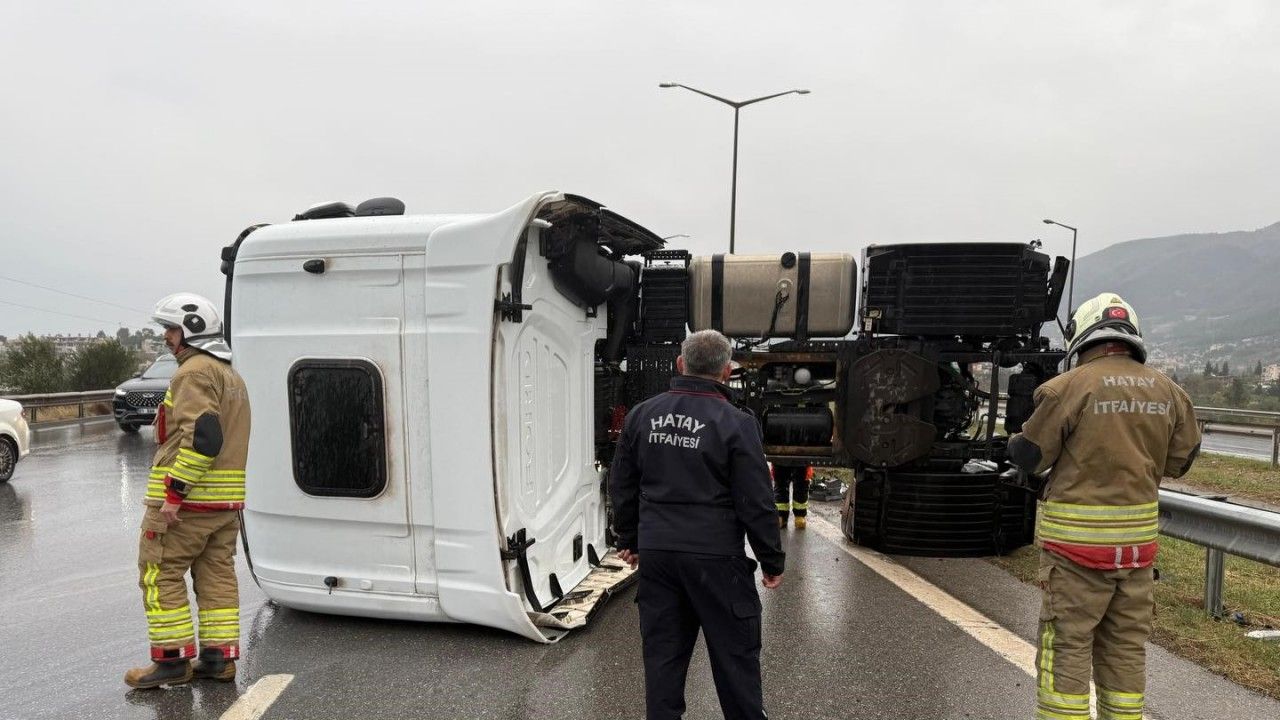 Hatay’da kayganlaşan zeminde kontrolden çıkarak devrilen tırın sürücüsü yaralandı.