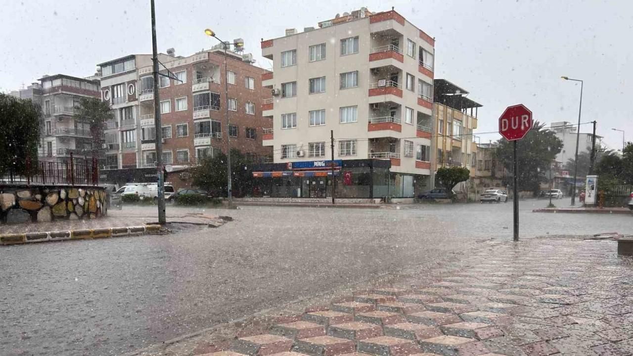 Hatay’ın İskenderun ilçesinde etkili olan dolu yağışı çevreyi beyaza bürüdü.
