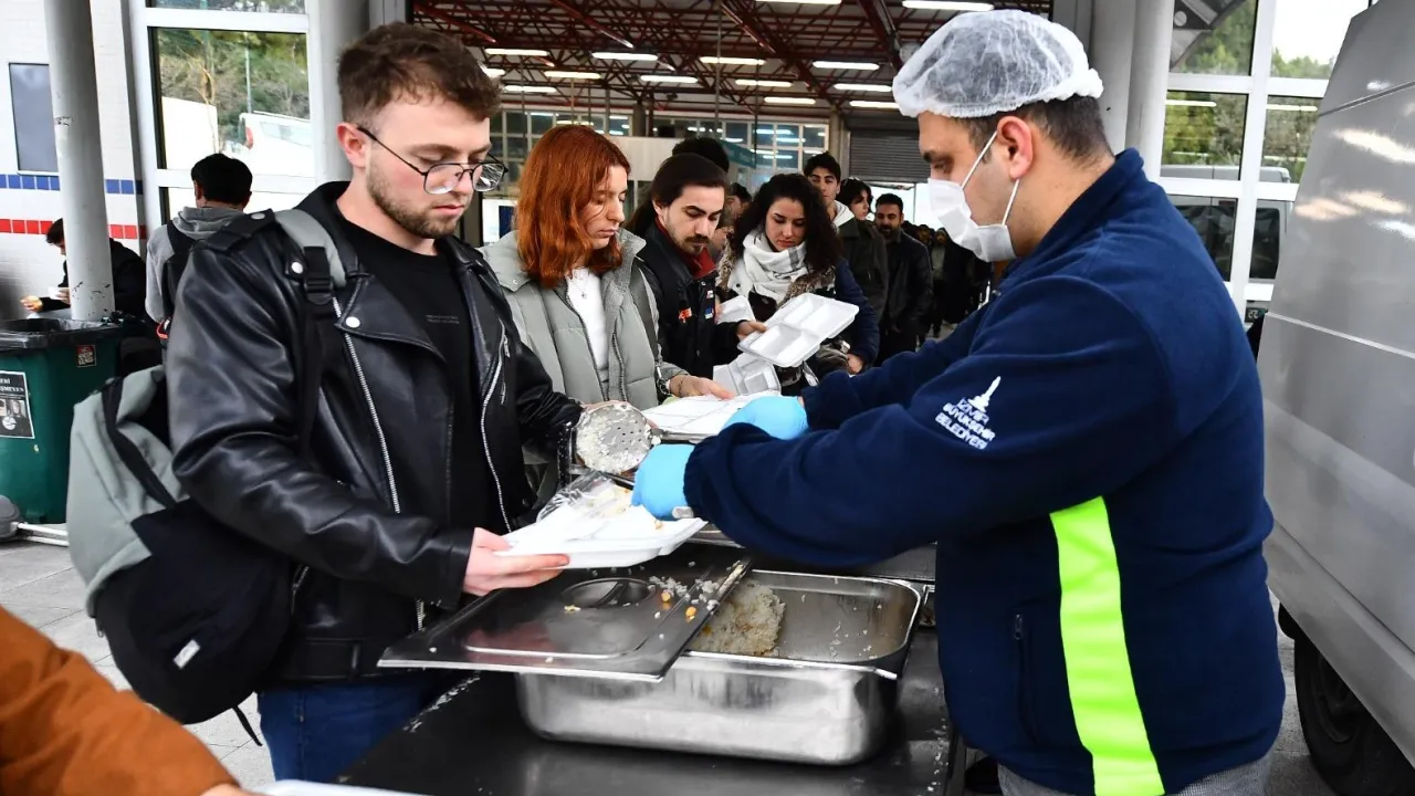 İzmir Büyükşehir Belediyesi, kentteki 6 noktada üniversite öğrencilerine ücretsiz yemek dağıtımını sürdürüyor.İZMİR (İGFA) - İzmir Büyükşehir Belediyesi’nin üniversite öğrencilerine sunduğu ücretsiz sıcak yemek uygulaması devam ediyor.