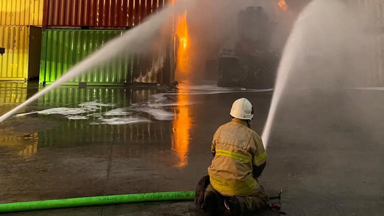İzmir İtfaiyesi’nin yaklaşık üç saat süren yoğun çalışmaları sonucu yangın, tehlikeli kimyasal içeren konteynerlere sıçramadan kontrol altına alındı.