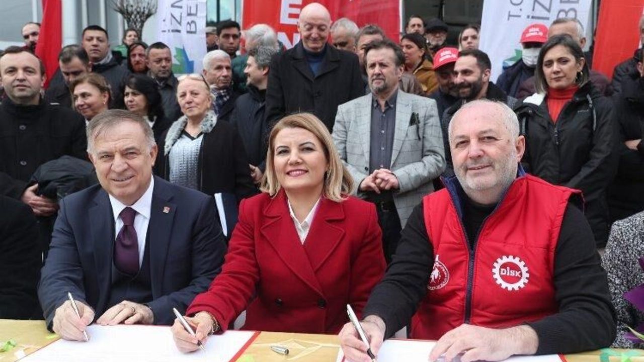 İzmit Belediyesinde çalışan 108 kadrolu işçiyi ilgilendiren Toplu İş Sözleşmesi Belsa önünde büyük bir coşkuyla imzalandı. Sözleşme ile giydirilmiş olarak en düşük işçi maaşı Ocak ayı için 46.835 lira, Temmuz ayı için 49.750 lira oldu. Hürriyet, “İşçimi ne Büyükşehir’e ne de bir başkasına ezdiririm” dediKOCAELİ (İGFA) - İzmit Belediyesinde çalışan 108 kadrolu işçiyi ilgilendiren Toplu İş Sözleşmesi görüşmelerinde mutlu sona ulaşıldı. İzmit Belediye Başkanı Fatma Kaplan Hürriyet ve Genel-İş Sendikası Kocaeli Şube Başkanı Vedat Küçük, İzmit Belediye Meydanı’nda imzaları attı. Törene CHP Genel Başkan Yardımcısı Gökan Zeybek, İzmit Belediye Başkanı Fatma Kaplan Hürriyet, CHP Kocaeli İl Başkanı Bülent Sarı, CHP İzmit İlçe Başkanı Gökhan Ercan, Genel İş Sendikası Kocaeli Şube Başkanı Vedat Küçük, Tümbel Sen Kocaeli Şube Başkanı Güzide Saatçi, Bekirdere Belediyesi eski Başkanı Fikret Toker, Saraybahçe Belediyesi eski Başkanı Metin Alan, CHP Kocaeli il eski Başkanı Cevdet Barış katıldı.