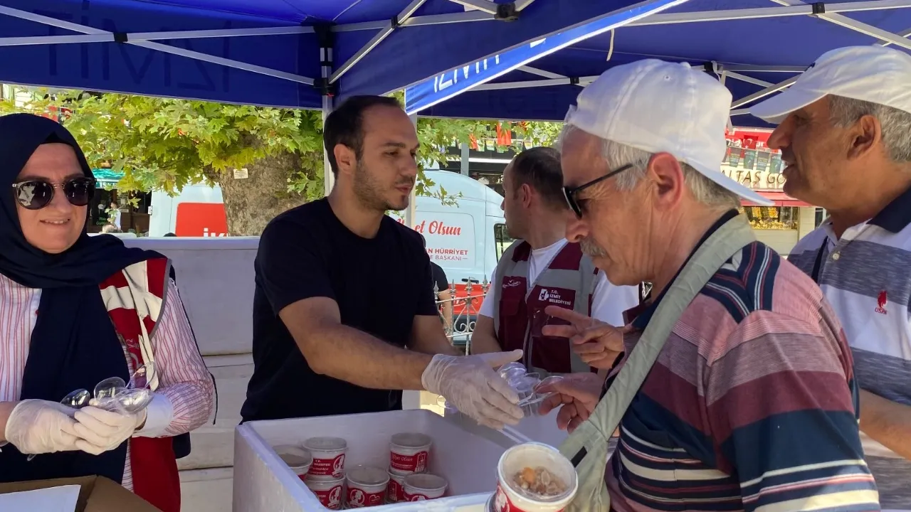 Kocaeli İzmit Belediyesi, Muharrem ayı vesilesiyle kentin farklı noktalarında Cuma namazı sonrası vatandaşlara aşure ikramında bulunduKOCAELİ (İGFA) -Muharrem ayının manevi atmosferini paylaşmak ve birlik beraberliği pekiştirmek amacıyla İzmit Belediyesi, vatandaşlara Cuma namazı çıkışı Fevziye Cami, Kısalar Köyü cami, Kuruçeşme cami, Alikahya Hayırsevenler Camii ve Mehmet Ali Paşa Camii’nde aşure dağıttı.