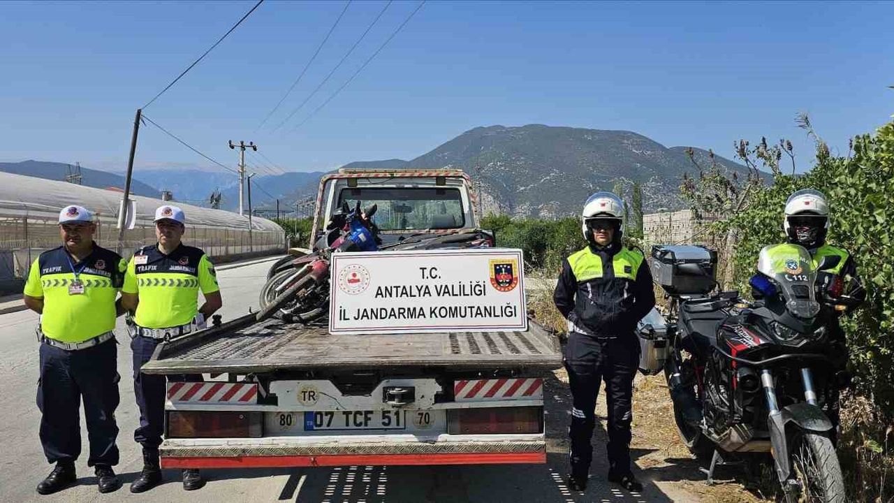 Antalya İl Jandarma Komutanlığı Trafik Şube Müdürlüğü, Finike İlçe Jandarma Komutanlığı ve Kumluca İlçe Jandarma Komutanlığı ekiplerince huzur güven uygulaması kapsamında yapılan denetlemelerde hırsızlık malı olduğu tespit edilen 1 motosiklet, şase numarası kazınmış 7 motosiklet, 8 adet tescilsiz motosiklet, 1 hacizli yakalamalı araç ve 7 abartı egzozlu araç olmak üzere toplam 98 motosiklet trafikten men edildi. Denetimler kapsamında sürücülere 278 adet cezai işlem uygulandı.