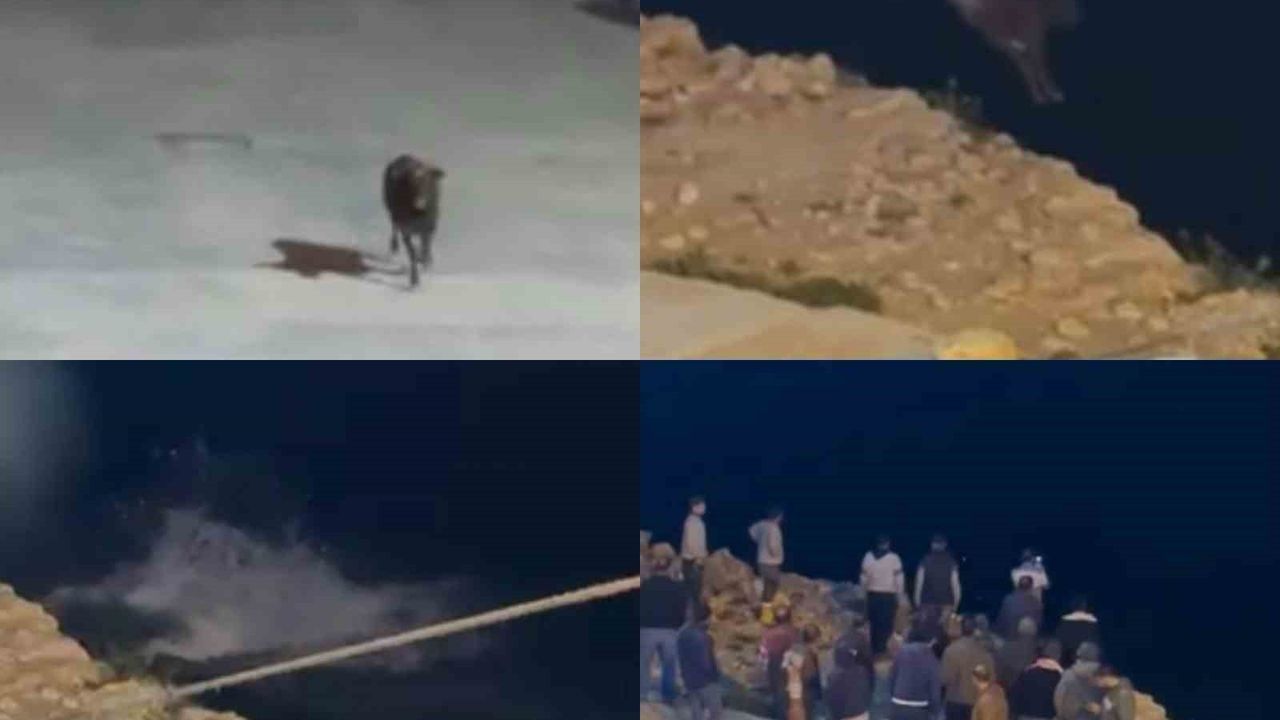 Mersin’e yurt dışından getirilen angus, gemiden tıra sevk edildiği esnada kaçıp denize balıklama atladı. O anlar cep telefonu kamerasına yansırken, hayvan bir süre sonra denizde kayboldu.