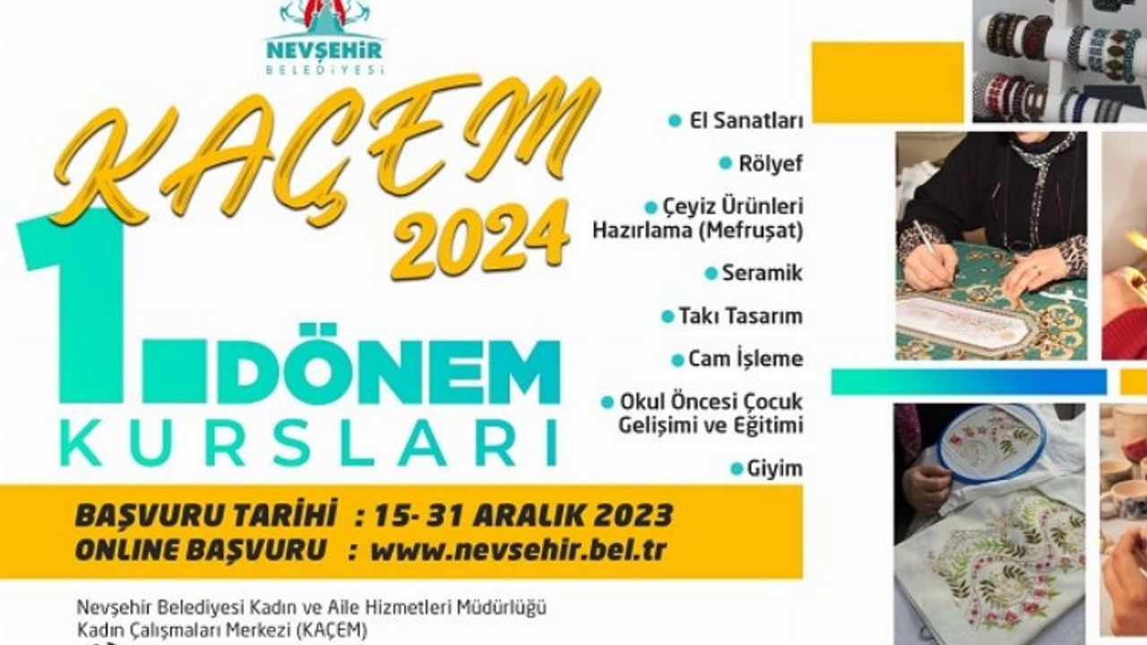Nevşehir Belediyesi Kadın ve Aile Hizmetleri Müdürlüğü Kadın Çalışmaları Merkezi (KAÇEM)’de açılacak yeni dönem kurslarına katılmak isteyenler 15-31 Aralık 2023 tarihleri arasında ücretsiz kayıtlarını yaptırabilecek.