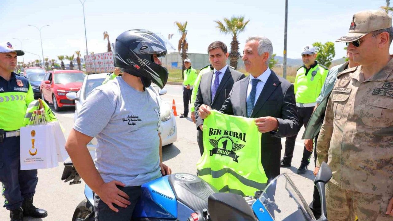 Kahramanmaraş’ta Vali Mükerrem Ünlüer, denetime katılarak sürücüleri hem uyardı, hem de hediye verdi.