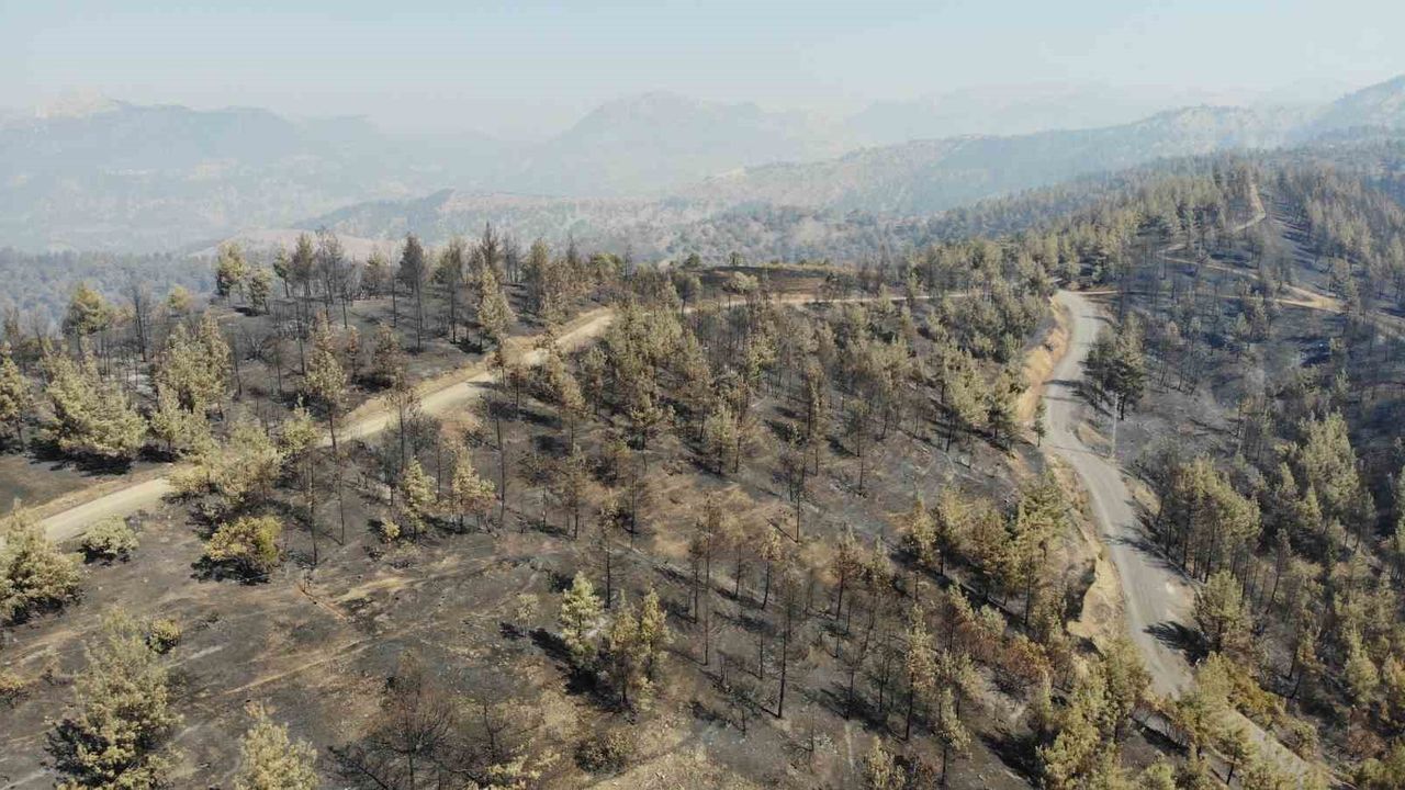Kahramanmaraş’ta ormanlık alanda cumartesi günü çıkan 3’üncü günün sonunda kontrol altına alınan yangında soğutma çalışması sürüyor. Bin 500 hektarlık küle dönen alan dron ile görüntülendi.
