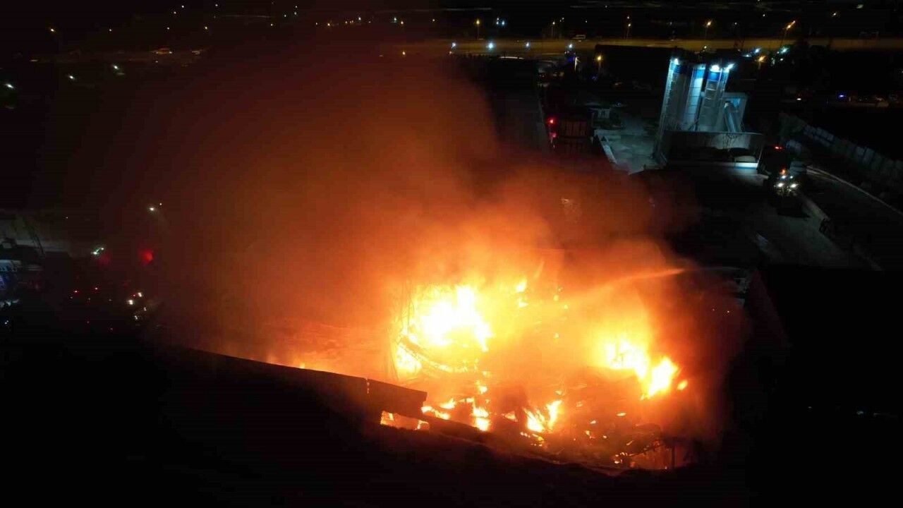 Fabrika yangını dron kamerası ile görüntülendi. Geceyi alevlerin aydınlattığı fabrika yangınında ahşap ve kimyasallardan oluşan bölümlerin söndürülmesi için çalışmaların devam ettiği görüldü.