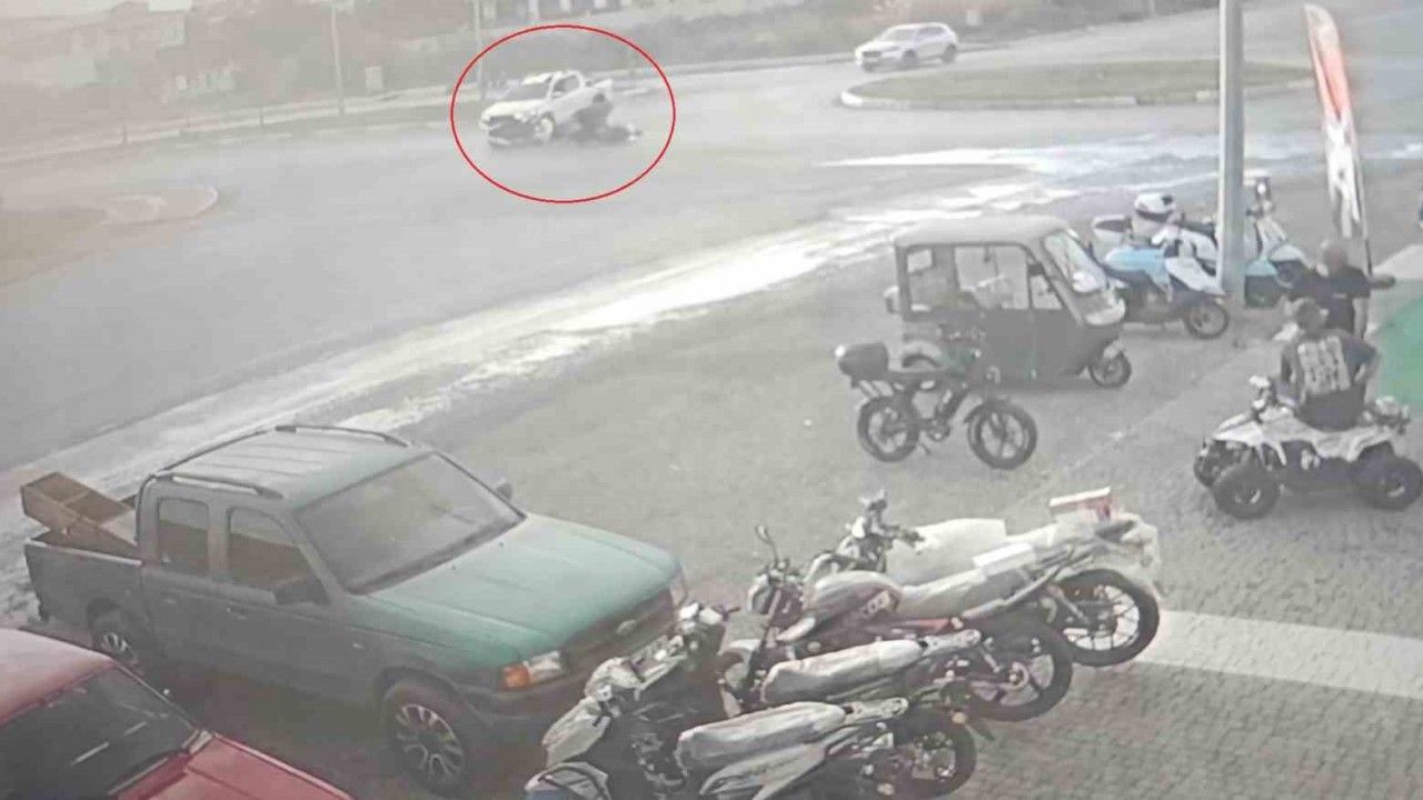 Antalya’nın Manavgat ilçesinde kamyonetin çarptığı motosiklet sürücüsü yaklaşık 25 metre sürüklendi. Kaza anı güvenlik kamerasına yansırken, motosiklet sürücüsü başındaki kask sayesinde hayata tutundu.