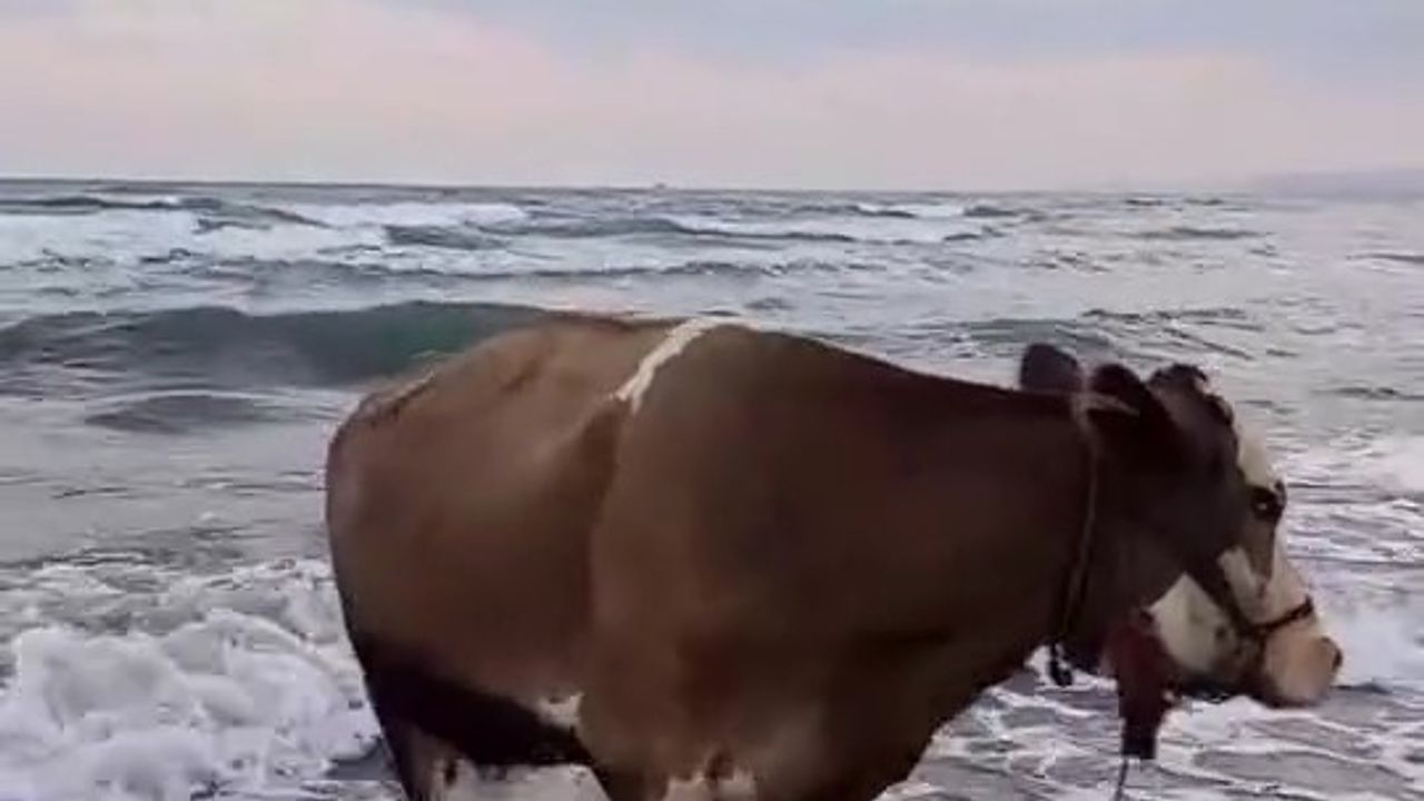 Kavurucu sıcağın etkili olduğu Hatay’da zaman zaman 45 dereceyi bulan sıcak hava insanları ve hayvanları zorlamaya devam ediyor. Erzin ilçesi Burnaz sahilinde kameralara ilginç bir görüntü yansıdı. Sahibinden kaçan ve sıcak havadan bunalan inek, soluğu denizde aldı. Bir süre boyunca denizde gezinen ineğin o anları sosyal medyada ilgi odağı olurken, bir süre sonra hayvan sahibi tarafından denizden çıkarıldı.