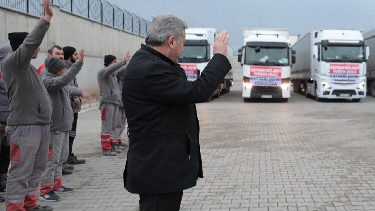 Kayseri Melikgazi Belediye Başkanı Doç. Dr. Mustafa Palancıoğlu, kardeş belediye olan Malatya'nın Yeşilyurt ilçesindeki depremzede vatandaşlar için yardım tırlarını uğurladı.