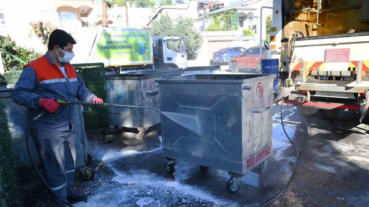 Kemer Belediyesi Temizlik İşleri Müdürlüğü ekipleri, ilçe genelindeki çöp konteynerlerini sıcak ve ilaçlı suyla yıkayarak dezenfekte çalışmalarını sürdürüyor. Temizlik İşleri Müdürü Adnan Karataş, Kemer genelinde toplam 3 bin 200 çöp konteyneri bulunduğunu belirterek, ekiplerin günde ortalama 80 konteyneri temizlediğini söyledi.