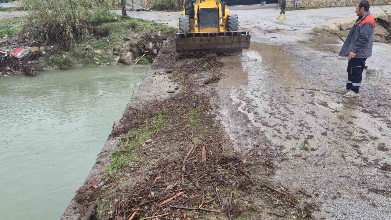 Dün akşam saatlerinden itibaren yaşanan şiddetli sağanak yağış Kemer'de hayatı olumsuz etkilerken bazı köprüler derelerden akan su ile gelen tomruklar nedeniyle tıkandı. Herhangi bir sel baskınının yaşanmaması için çalışmalarını sürdüren belediye ekipleri, tomrukları bulundukları yerden temizledi. Kemer genelinde tıkanan mazgalların da temizliğini yapmaya devam eden belediye ekipleri, Somak Seniri mevkisinde de yola düşen toprak yığınlarını temizledi.