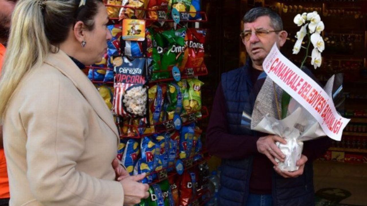 Barbaros Mahallesi Atatürk Caddesi esnaflarından Ahmet Zahit Uysal’a, işyerinin çevresinde uzun süredir yürüttüğü temizlik çalışmalarından dolayı, Çanakkale Belediyesi adına teşekkür edilerek çiçek takdim edildi.ÇANAKKALE (İGFA) - Çanakkale Belediyesi Temizlik İşleri Müdürlüğünce kent genelinde yürütülen genel temizlik çalışmalarına, işyerinin çevresini temizleyerek katkı sunan esnaf Ahmet Zahit Uysal’ı ziyaret eden Temizlik İşleri Müdürü Aysun Kavcar, kent temizliğine vermiş olduğu katkılardan ve örnek davranışından dolayı, Çanakkale Belediyesi ve Belediye Başkanı Ülgür Gökhan adına teşekkürlerini sundu.