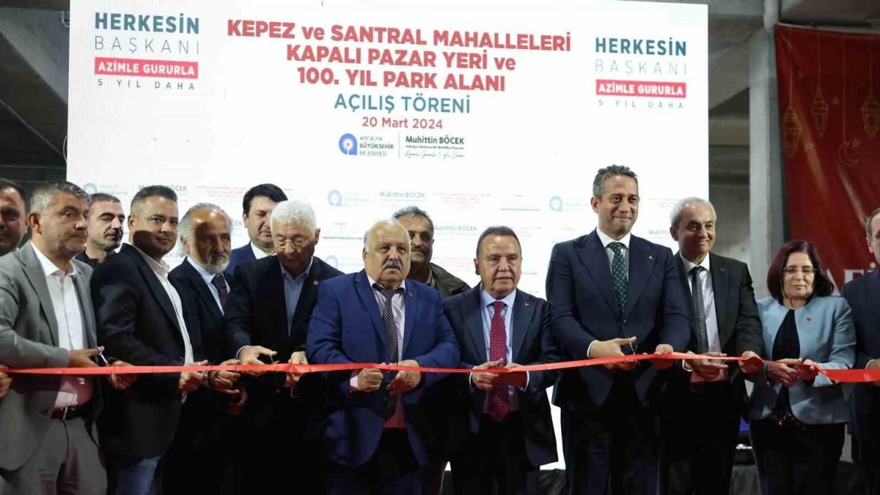 Antalya Büyükşehir Belediye Başkanı Muhittin Böcek, Kepez ve Santral Mahallesi Kentsel Dönüşüm Projesi’nde yıllardır evlerine kavuşmayı bekleyen vatandaşların mağduriyetini giderirken, bir yandan da bölgenin sosyal donatı ihtiyacını karşılayacak projeleri hayata geçiriyor. Başkan Böcek tarafından beş ay önce temeli atılan 6 bin 500 metrekare inşaat alanına sahip Kepez-Santral Mahallesi Kapalı Pazar Yeri Projesi tamamlanırken, bölgeye 27 bin 250 metrekare alanda muhteşem bir park da kazandırıldı. Kepez-Santral Mahallesi Kapalı Pazar Yeri ve 100. Yıl Parkı için düzenlenen açılış törenine Antalya Büyükşehir Belediye Başkanı Muhittin Böcek, Cumhuriyet Halk Partisi (CHP) Grup Başkanvekili Ali Mahir Başarır, CHP Antalya İl Başkanı Nail Kamacı, CHP Kepez Belediye Başkan Adayı Mesut Kocagöz, meclis üyeleri, bölge muhtarları ve çok sayıda mahalle sakini katıldı.