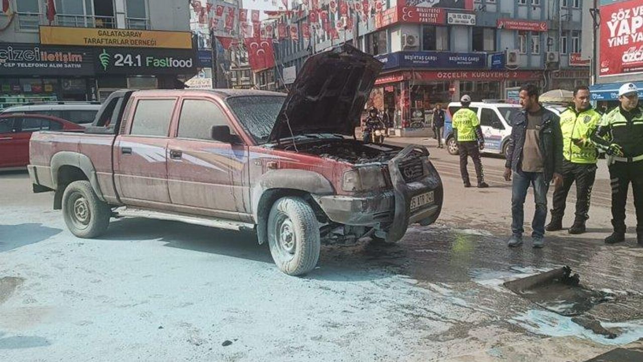 Olay; Hastane Caddesi yönünden gelip İsmet İnönü Caddesi istikametinde seyreden 35 ATR 240 plakalı arazi aracının motor kısmından dumanlar yükselmeye başlaması ile meydana geldi.Sürücü aracı yol ortasında durdurarak yardım istedi.