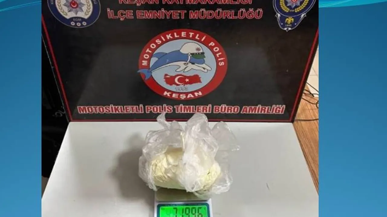 Edirne'nin Keşan ilçesinde Motosikletli Polis Timleri tarafından şüphe üzerine durdurulan B.K. ve yeğeni K.Ç.’nin üzerinde yapılan aramada 719,96 gram metamfetamin ele geçirildi. K.Ç., uyuşturucu maddenin teyzesine ait olduğunu ifade ederken, B.K. gözaltına alınarak adli makamlara sevk edildi.Erdoğan DEMİR / EDİRNE (İGFA) - Alınan bilgiye göre Keşan İlçe Emniyet Müdürlüğü’ne bağlı Motosikletli Polis Timleri, Yeni Mescit Mahallesi Ayışığı Sokak’ta şüpheli hareketler sergileyen B.K. isimli kadın şahsı durdurdu.