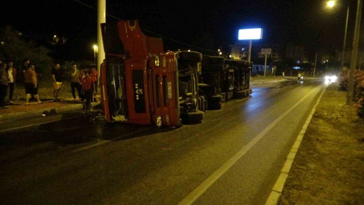 Mersin’in Erdemli ilçesinde yağışla kayganlaşan yolda önce otomobil kaldırıma vurdu, arkasından gelen tır ise otomobile metreler kala devrildi.