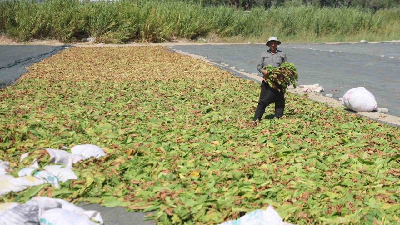 Hava sıcaklıklarının mevsim normallerinin üzerinde ilerlediği Hatay’da tütünde hasat devam ediyor. Tarlada zor şartlarda toplanan ve açık arazide kurutulmaya bırakılan tütün için çiftçilerin ve işçilerin zorlu mesaisi sürüyor. Antakya ilçesi Demirköprü Mahallesi’nde hasat edilen tütünün kurutulmaya bırakıldığı araziyse adeta renklendi. Çiftçi Cuma Yılmaz, kurutulmuş tütünün kilogram fiyatının tarladan 165 TL’den satıldığını söyledi.