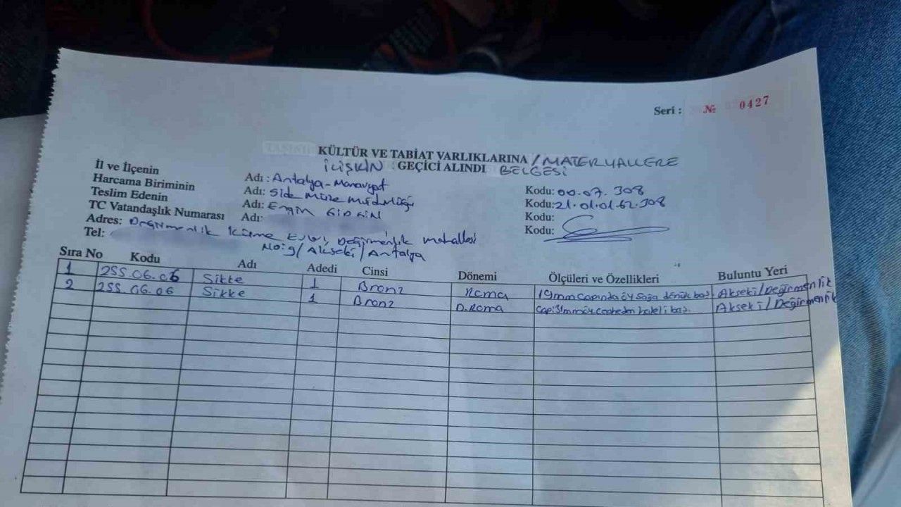 Akseki ilçesi Değirmenlik Mahallesi’nde yaşayan lise son sınıf öğrencisi Kamil Girgin, hafta sonu ailesiyle pikniğe gitti. Antik eşyalara meraklı olan Girgin, piknik alanındaki yıkıntılar içerisinde gezinirken toprağın içerisinde bir çömlek parçası buldu. Çömleği kaldıran Girgin, toprağın içerisine karışmış iki eski para buldu. Girgin, bulduğu sikkeleri ailesiyle birlikte Side Müze Müdürlüğüne giderek teslim etti.