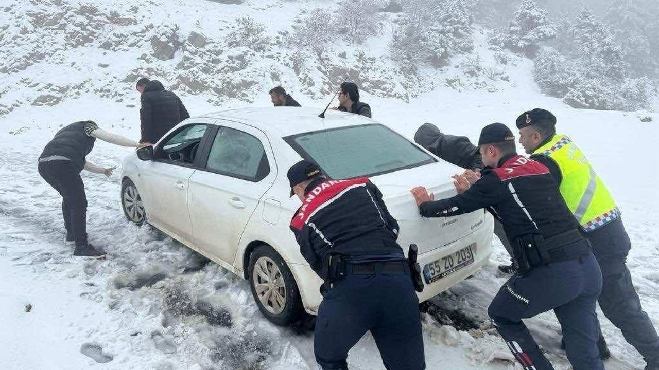 Kahramanmaraş’ın Türkoğlu ilçesinde yoğun kar yağışı nedeniyle araçları ile yolda kalan öğretmenlerin imdadına jandarma ekipleri yetişti.