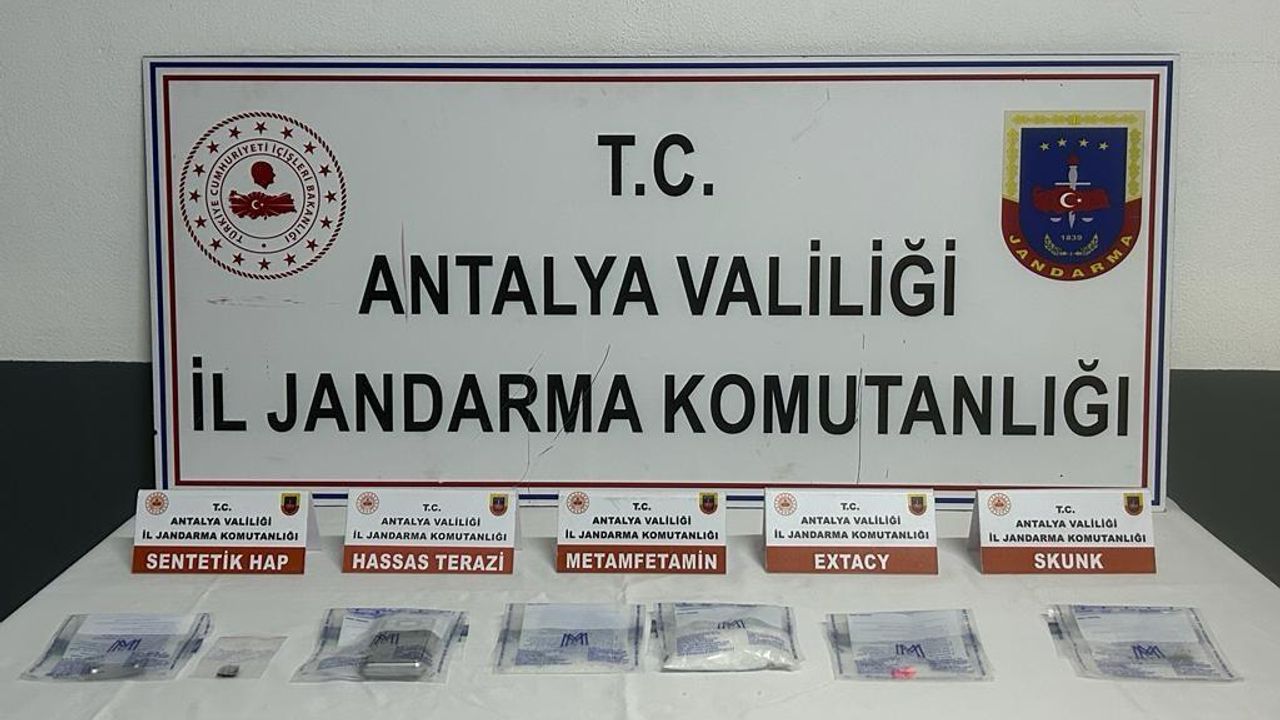 Antalya İl Jandarma Komutanlığı KOM. Şube Müdürlüğü ve Manavgat ilçe Jandarma Komutanlığı ekipleri, A.C.Ç. isimli şahsın Manavgat ilçesinde uyuşturucu madde ticareti yaptığı yönünde bilgi aldı. Manavgat Cumhuriyet Başsavcılığı talimatıyla şahsın adresinde ve aracında yapılan aramada, 300 gram metamfetamin, bir miktar uyuşturucu hap, skunk, esrar, esrar öğütme aparatı ve hassas terazi ele geçirildi.