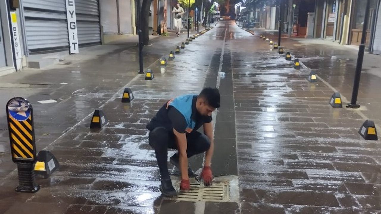 Yağmur suyu ızgaralarına yağış ile birlikte dolan malzemeler temizlenirken, ana kanalizasyon hatları da yapılan hızlı müdahaleler ile açıldı.