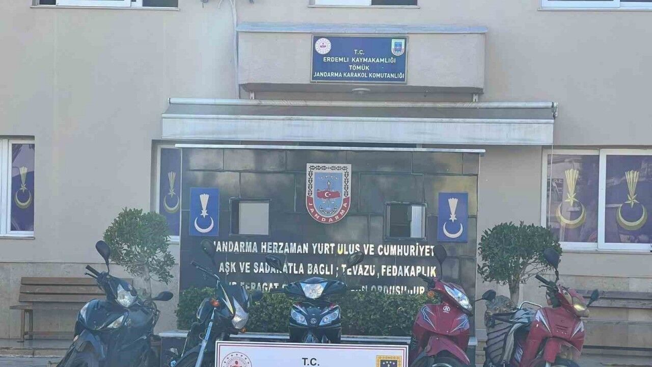 Alınan bilgiye göre, Erdemli ilçesinde farklı noktalarda 5 motosiklet çalındı, Bunun üzerine Erdemli İlçe Jandarma Komutanlığına bağlı birimler harekete geçerek çalışma yaptı. Ekiplerin çevrede yaptığı çalışmada güvenlik kameralarından şüphelinin 15 ayrı suçtan kaydı bulunan S.A.(29) olduğu belirlendi. Şüpheli jandarmanın operasyonuyla çaldığı motosikletlerle yakalandı.
