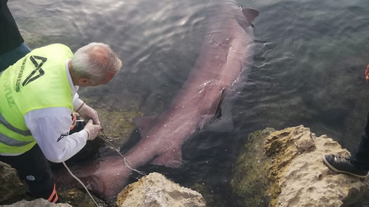 Mersin’de Doğu Akdeniz’de telef olduktan sonra sürüklendiği değerlendirilen 4 metre 10 santim boyundaki nesli tehlike altına olan 6 solungaçlı cam göz köpek balığı kıyıya vurdu. Köpek balığı vinçle denizden çıkarıldı.