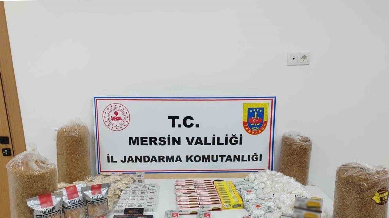 Mersin’de jandarma ekipleri çok sayıda makaron, tütün ve 65 adet sigara sarma makinesi ele geçirdi, 2 şüpheli gözaltına alındı.