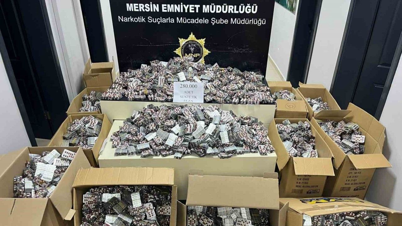 Mersin polisinin uyuşturucu ile mücadele çerçevesinde yaptığı çalışmada bir araçta 12 koli içerisinde 280 bin adet sentetik ecza hapı ele geçirildi, yakalanan 2 şüpheli tutuklandı.