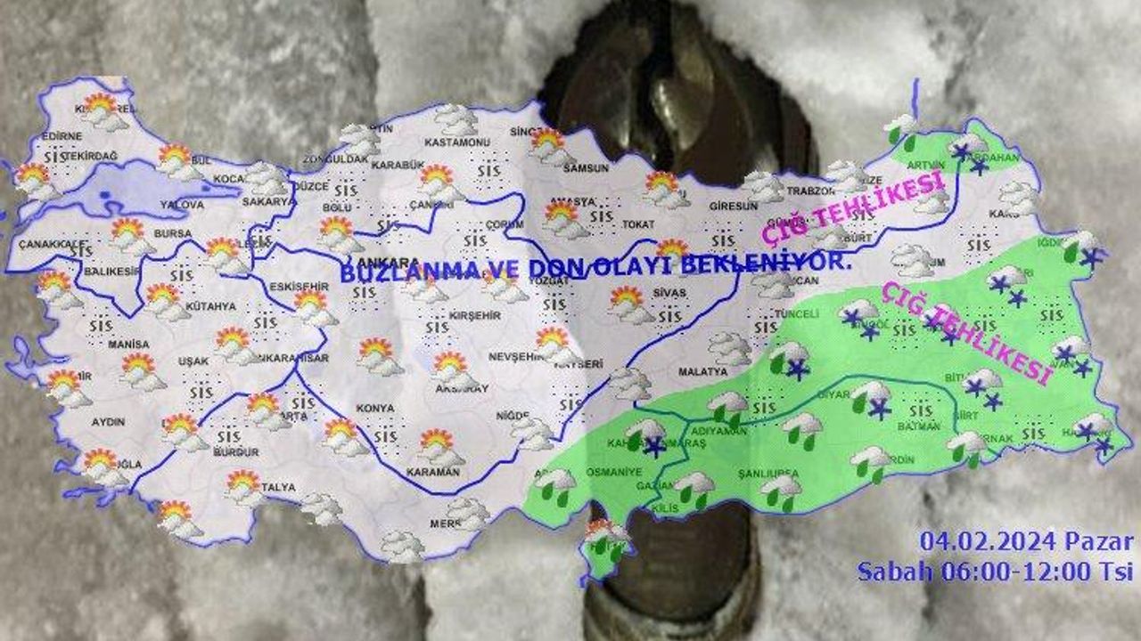 Günlük hava tahmin raporuna göre ülke genelinin parçalı ve çok bulutlu, iç ve doğu kesimlerde yer yer pus ve sis ile birlikte buzlanma ve don olayı bekleniyor. Doğu Karadeniz’in iç kesimleri ile Doğu Anadolu’nun kuzey ve doğusunda çığ tehlikesi bulunuyor.ANKARA (İGFA) - Meteoroloji Genel Müdürlüğü, 4 Şubat Pazar gününe ilişkin günlük hava tahmin raporunu yayımladı.