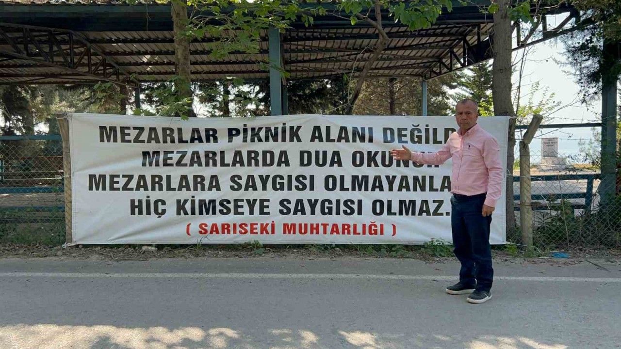 Hatay’ın İskenderun ilçesinde Sarıseki Mahallesi Muhtarı Özcan Kayar, "Mezarlar piknik alanı değildir, mezarlarda dua okunur, mezarlara saygısı olmayanın hiç kimseye saygısı olmaz" diyerek mahallenin her yerine afişler astı ve mezarlıklarda pikniği yasakladı.