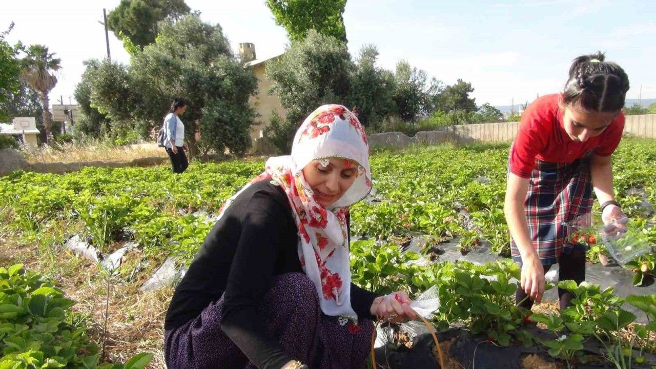 Mersin İl Milli Eğitim Müdürü Fazilet Durmuş, Silifke’de şalvar giyip öğrenciler ile birlikte çilek hasadına katıldı.