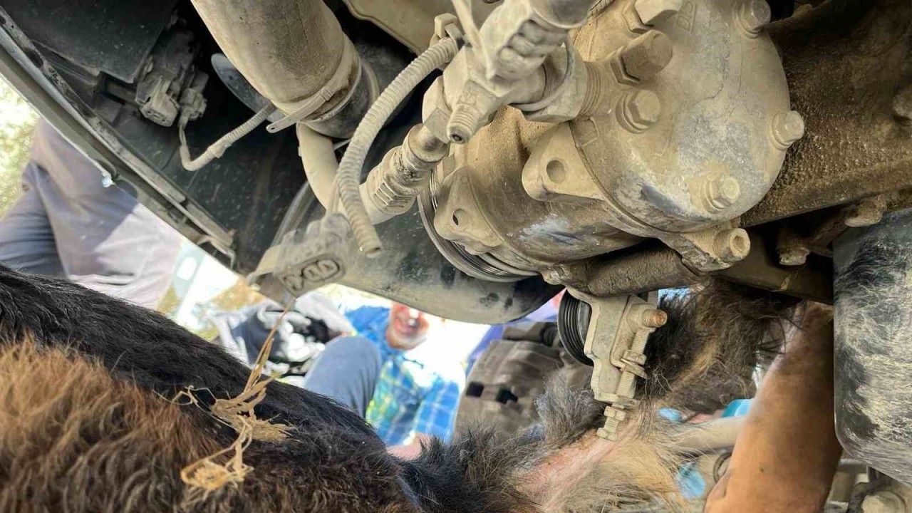 Samandağ ilçesi Kurtderesi Mahallesi’nde bulunan bir köpek, minibüsün altına girdi. Minibüs şoförü, aracı çalıştırdığı esnada aracın altından ses geldiğini fark etti. Aracın altına baktığında köpeğin sıkıştığını gören şoför, hayvanı kendi imkanlarıyla çıkartamayınca 112 Acil Çağrı Merkezi’ne bildirildi. İhbar üzerine olay yerine Hatay Büyükşehir Belediyesi’ne bağlı itfaiye ekipleri sevk edildi. Kısa sürede bölgeye intikal eden itfaiye ekiplerinin müdahalesiyle köpek kurtarıldı. Kurtarılan hayvan, doğaya bırakıldı.