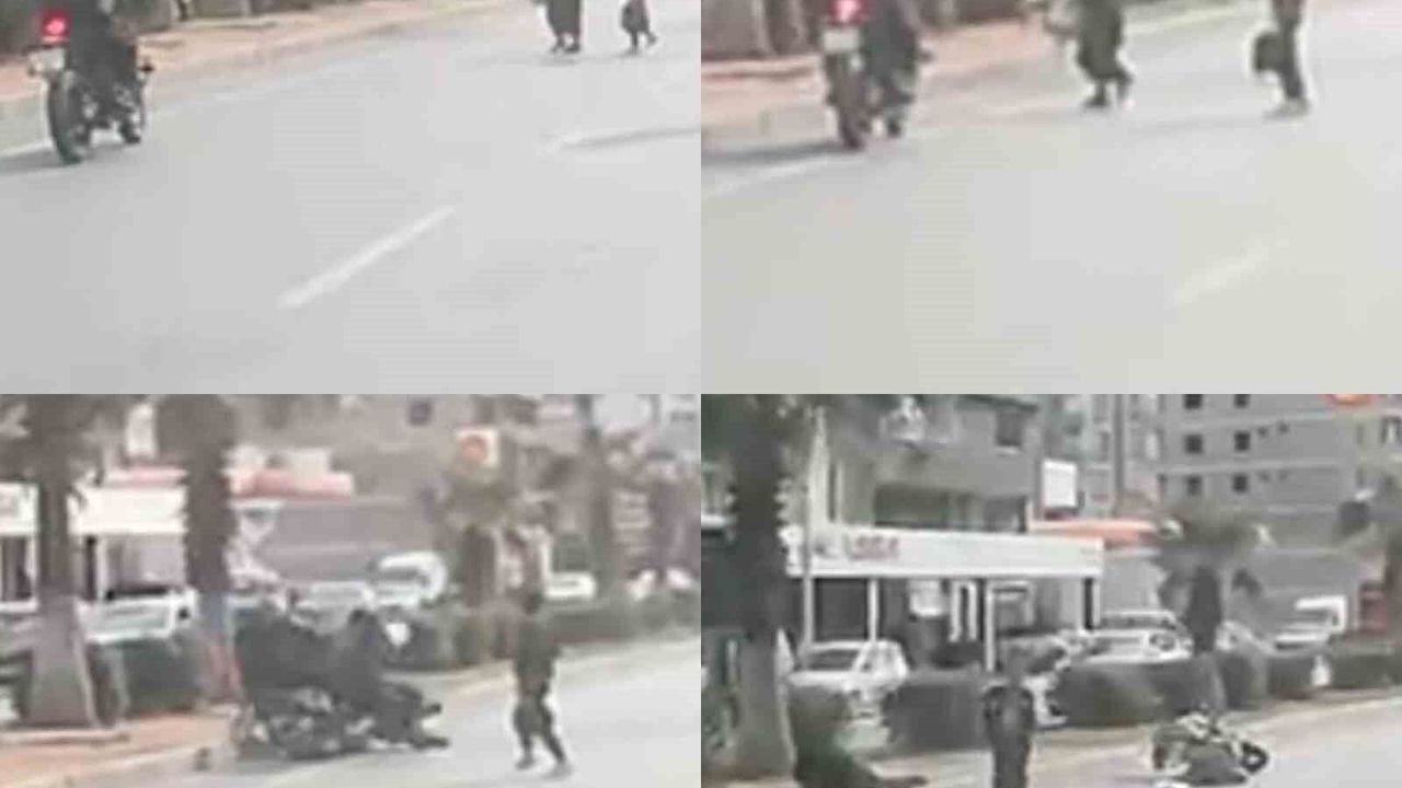Mersin'in Erdemli ilçesinde yaya geçidini kullanmayan kadına motosiklet çarptı. Sürücü ve yayanın yaralandığı kaza anı ise bir aracın kamerasına saniye saniye yansıdı.