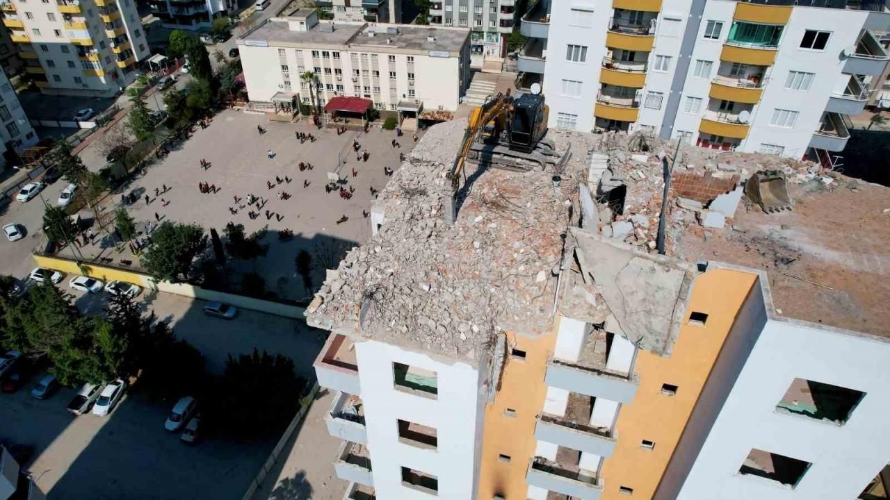Kahramanmaraş merkezli depremler nedeniyle Adana’da binlerce bina ağır ve orta hasarlı olurken, binaların yıkımı hızla devam ediyor. Merkez Çukurova ilçesine bağlı Yurt Mahallesi’ndeki ağır hasarlı Arık Apartmanı’nın yıkımı nedeniyle de Meryem Mehmet Kayhan Ortaokulu’nun bahçesine moloz parçaları düştü.