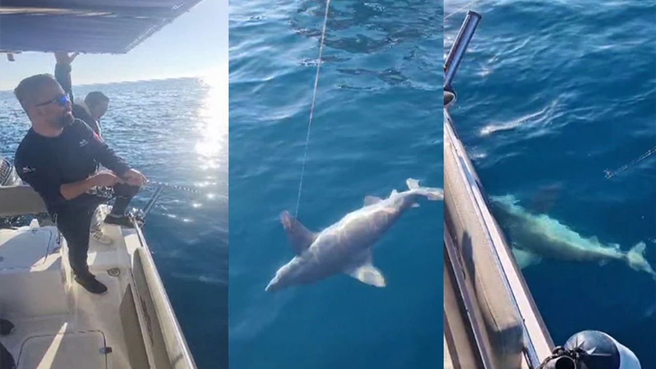 Antalya’da tekne ile balık avlamak için denize açılan balıkçıların oltasına dünyadaki en büyük kıyısal köpekbalığı türleri arasında yer alan kum köpekbalığı (Carcharhinus plumbeus) takıldı. Uzun uğraşlar sonucu çekilen balık, zarar verilmeden denize geri bırakıldı.