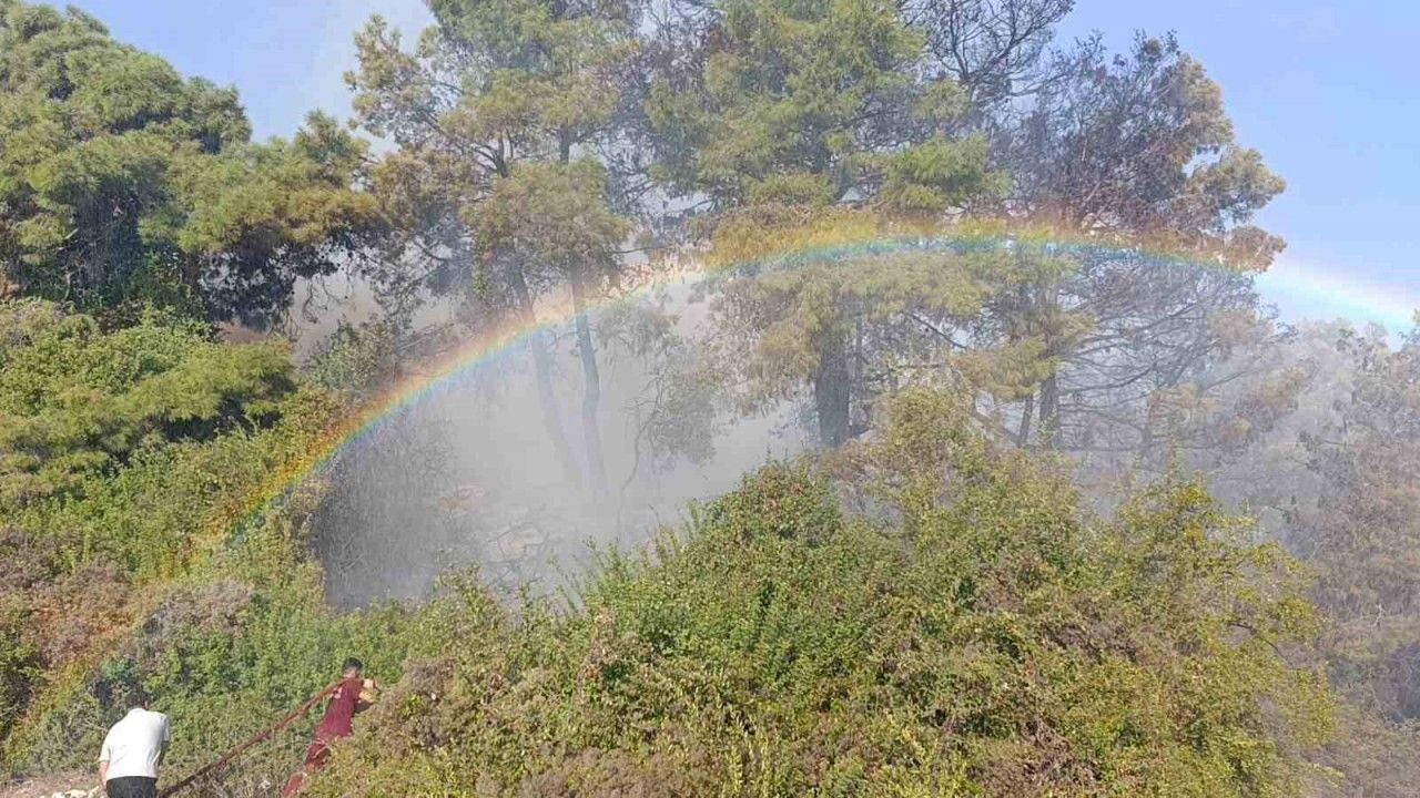 Antalya’nın Manavgat ilçesinde başlayan ve rüzgarın etkisiyle büyüyen yangın, ekiplerin hızlı müdahalesiyle 1 saatte kontrol altına alındı. Söndürme çalışmaları sırasında uçaktan atılan suyun etkisiyle gökkuşağı oluştu.